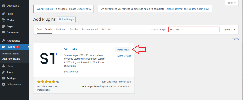- Click on Plugins, and then Add New Plugin, and in the search box, type SkillTriks