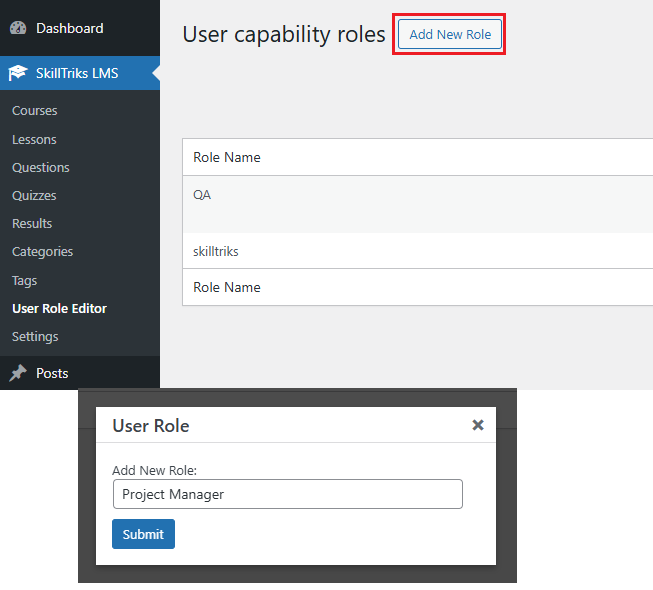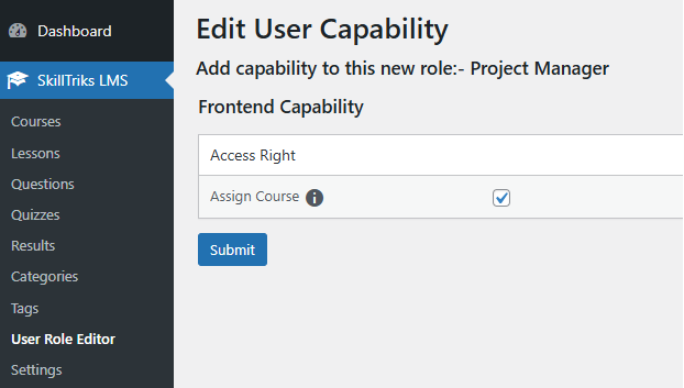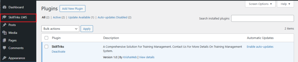 Now, if you click on SkillTriks LMS in the left menu, you’ll see four submenu options. Here’s a brief introduction to each one: