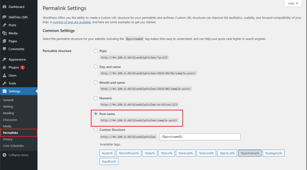 A permalink is the custom URL format for your website. SkillTriks needs the Post Name option to work properly because it uses that format for the dashboard and other links.