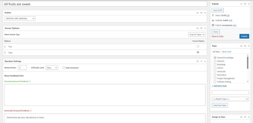 - Questions: The user can add various types of questions here, including True/False, Single Choice, Multiple Choice, and Fill in the Blank.
