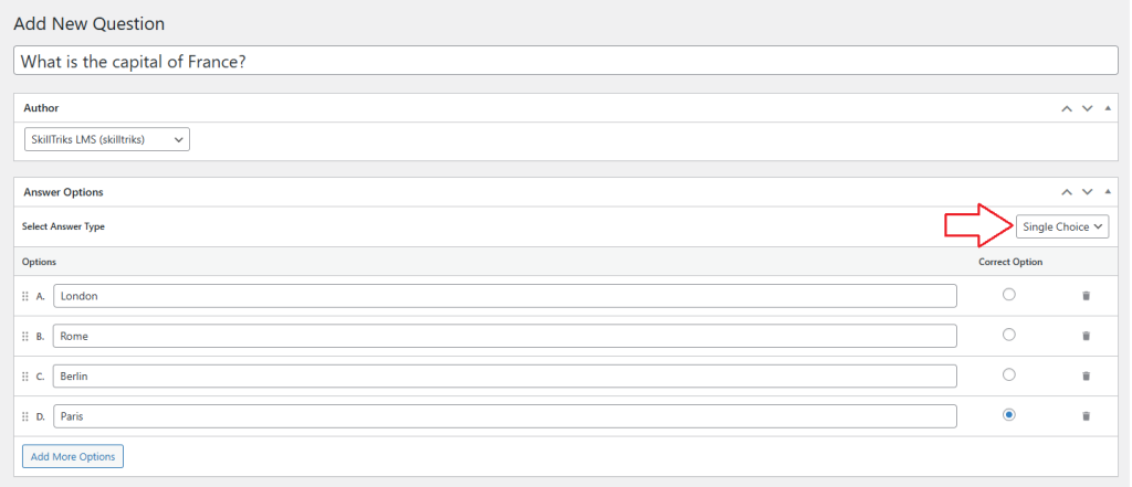 A single-choice question asks learners to pick one answer from many options. Only one answer is correct. To add a single-choice question, go to the answer options and choose the single-choice type.