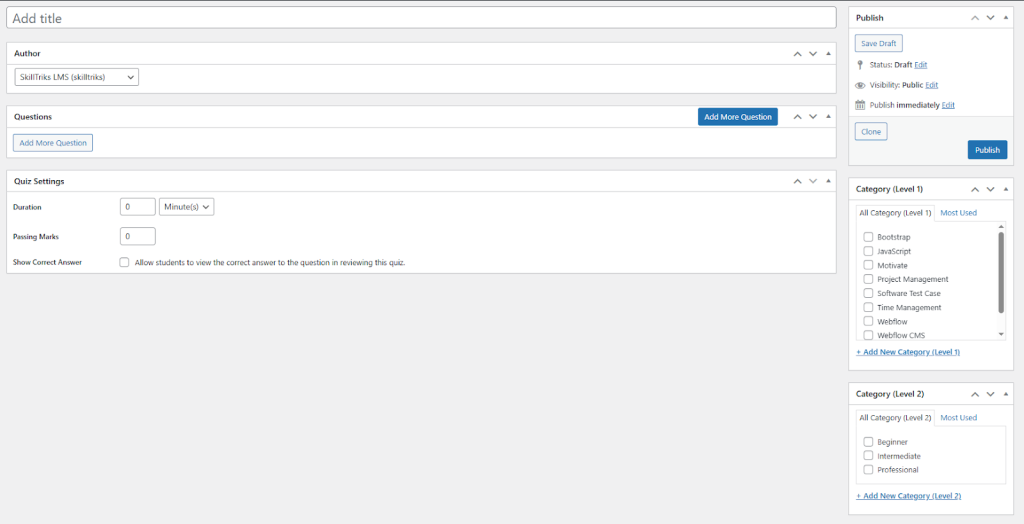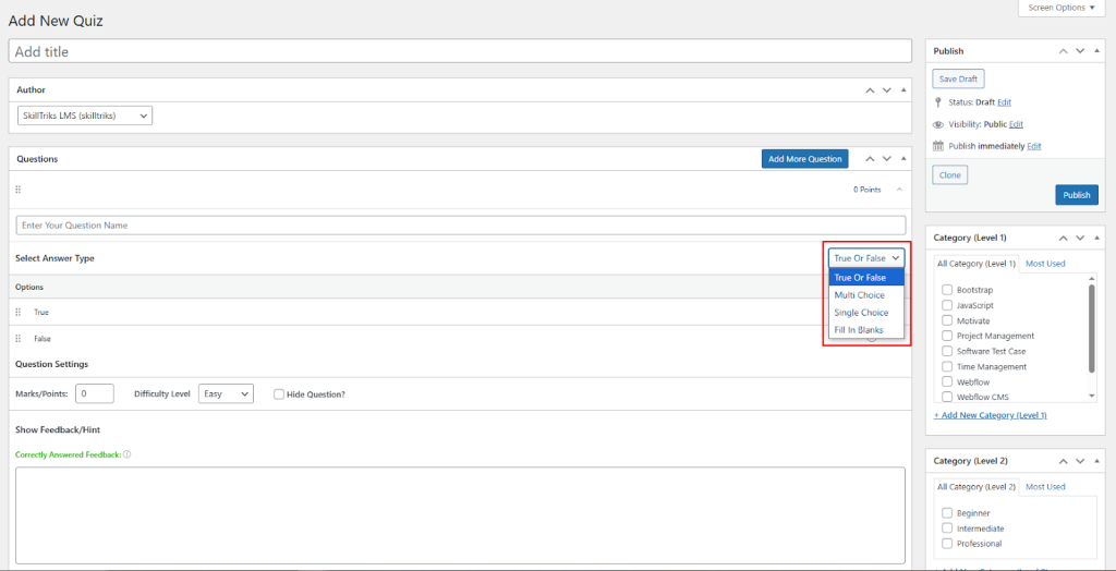 - Category (Level 2): This section allows you to select the difficulty level of the quiz, like Beginner, Intermediate, or Professional.