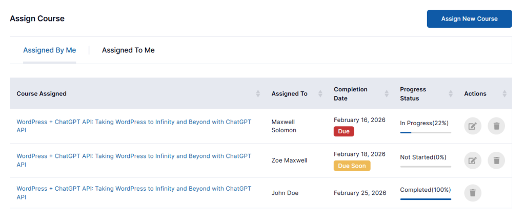 - Assigned To: Shows the name of the employee to whom the course has been assigned.