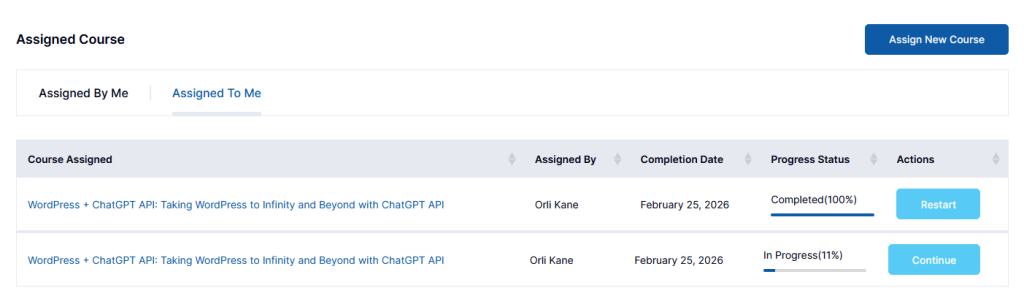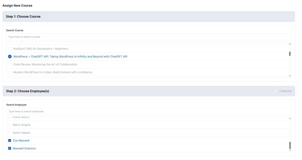 After completing all the required steps, click the Assign Course button to finalize the assignment. The selected course will be assigned to the chosen employee, along with any specified completion date.