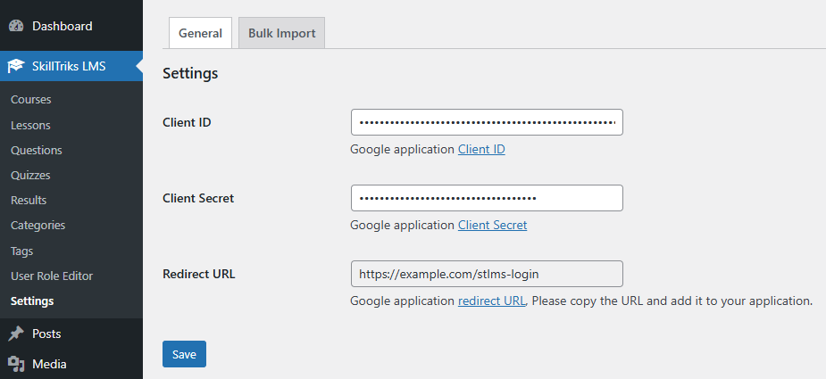 The Single Sign-On (SSO Login) feature allows admin to integrate Google authentication with the SkillTriks LMS platform. To enable this feature, the admin must enter the Google application Client ID and Client Secret in the SkillTriks Settings page and configure the provided Redirect URL in their Google Cloud Console application.