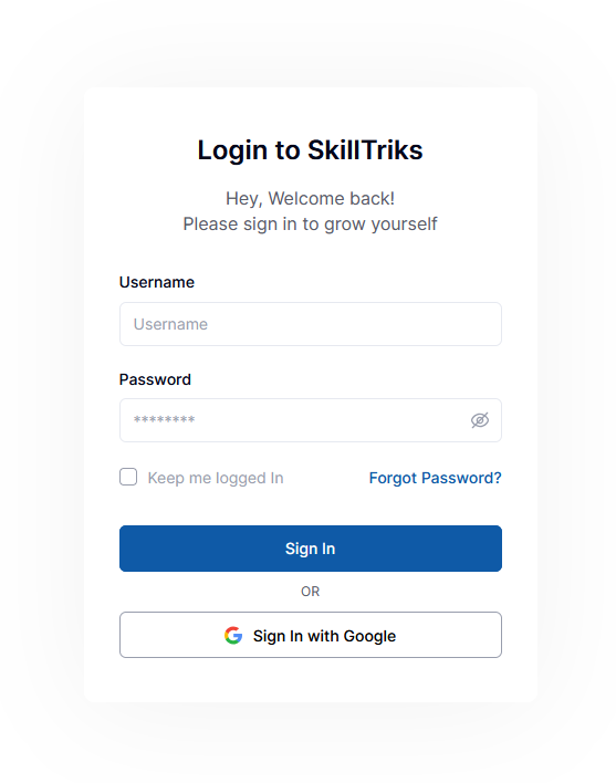 On the login page, users will see a “Sign In with Google” button below the standard login form. By clicking this button, users are redirected to Google for authentication, and upon successful verification, they are automatically logged into the SkillTriks LMS system.