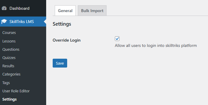 The Override Login option allows the admin to enable or disable frontend login access for all users from the SkillTriks Settings page.