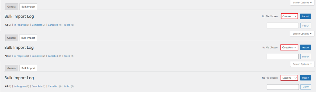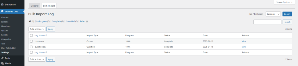 This functionality supports importing different types of content, including Questions, Lessons, and Courses, making it easy to quickly set up or migrate large amounts of LMS data. Once the file is uploaded and imported, the system tracks the progress and displays the import status in the Bulk Import Log for easy monitoring.