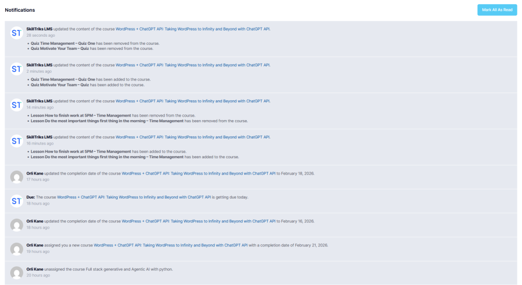 Whenever a Project Manager assigns a new course or unassigns an existing one, the employee receives an instant notification on this page. This helps employees clearly understand which courses they are responsible for and immediately recognize any changes to their learning plan.