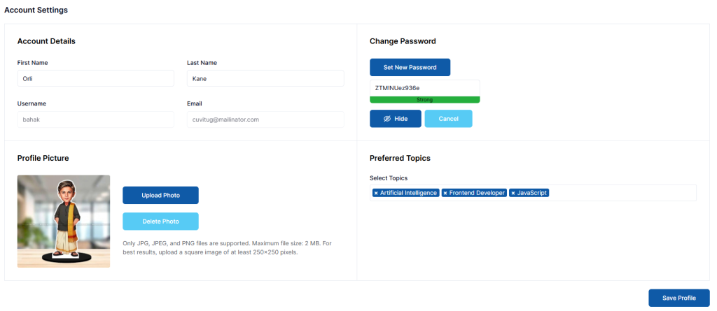 The Account Settings page on the frontend allows users to manage their personal information, security settings, and preferences. From this section, users can update their profile details, change their password, upload a profile picture, and select preferred learning topics.