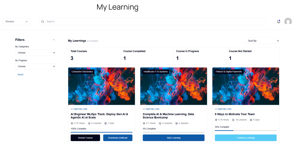 The My Learning page displays all the courses in which a user is currently enrolled. It provides a clear overview of learning progress, allowing users to track completed, ongoing, and not-started courses in one centralized dashboard. From this page, users can start, continue, or review their courses while monitoring their progress status in real time.