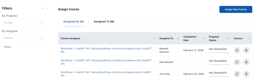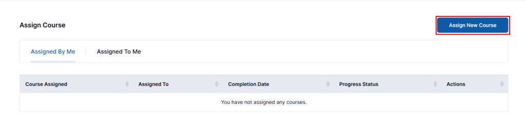 The Assigned By Me page provides Reporting Managers or Team Leads with a clear overview of all the courses they have assigned to employees. It allows them to monitor each employee’s progress, track completion status, review assigned deadlines, and make updates when necessary, ensuring that team training stays on schedule and properly managed.