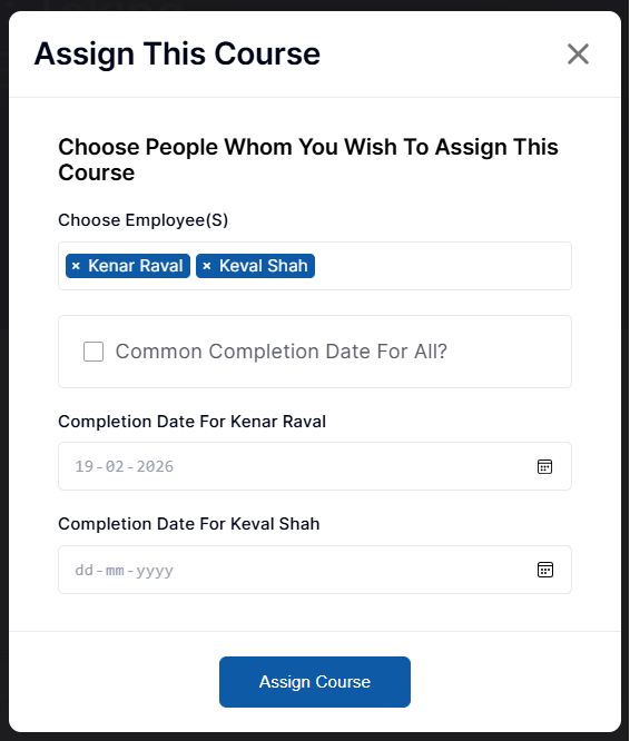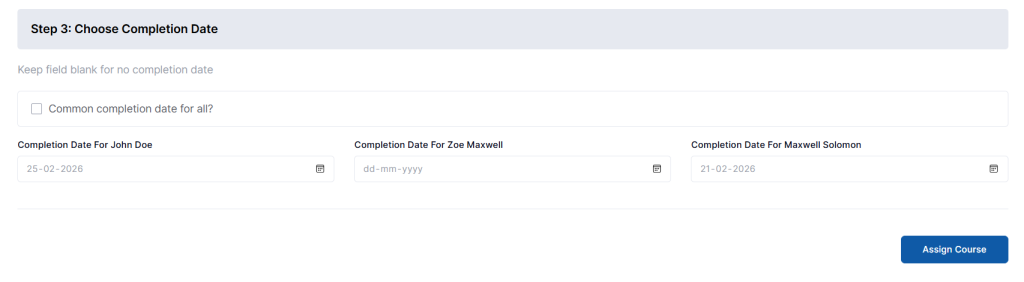 If the “Common completion date for all” checkbox is selected, a single date picker will appear. The selected date will apply to all chosen employees, and each must complete the course before that deadline.