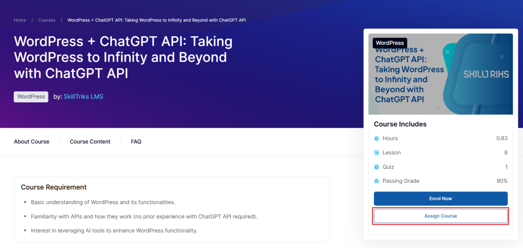 This method allows you to assign a specific course directly from its detail page without navigating to the dedicated Assign Course section.